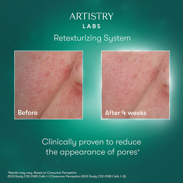 • The Artistry Labs Retexturizing System helps makes skin texture look up to 8 years younger in just 4 weeks, when the products are used together as advised.